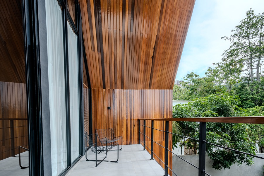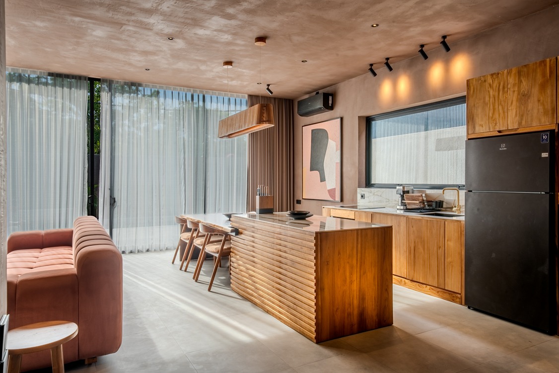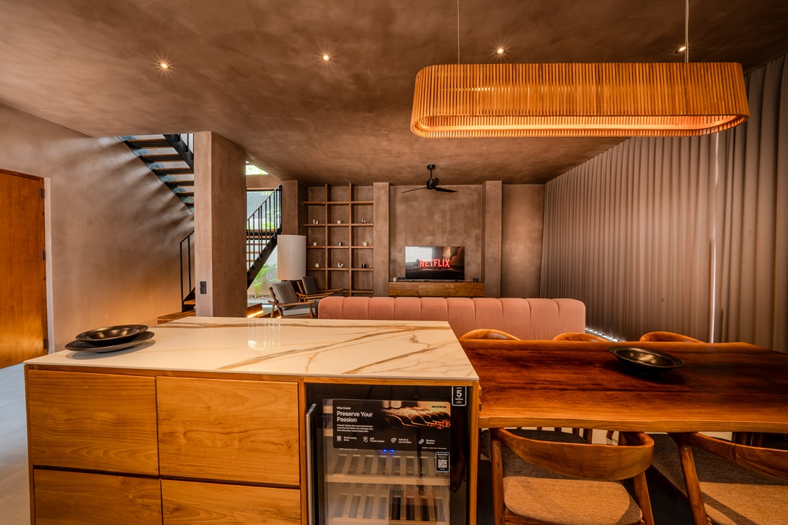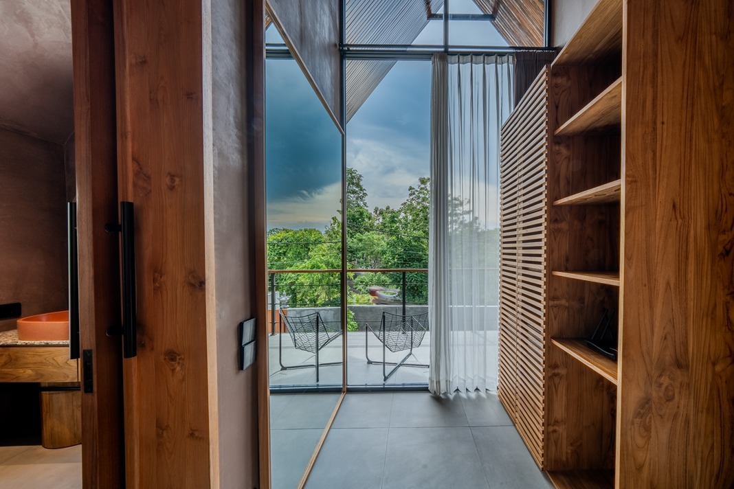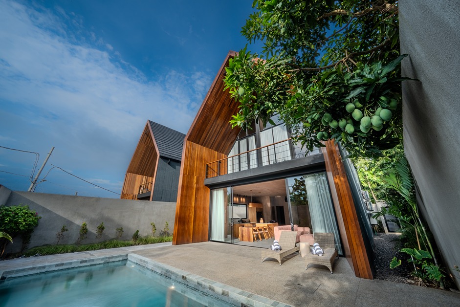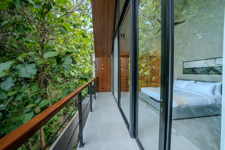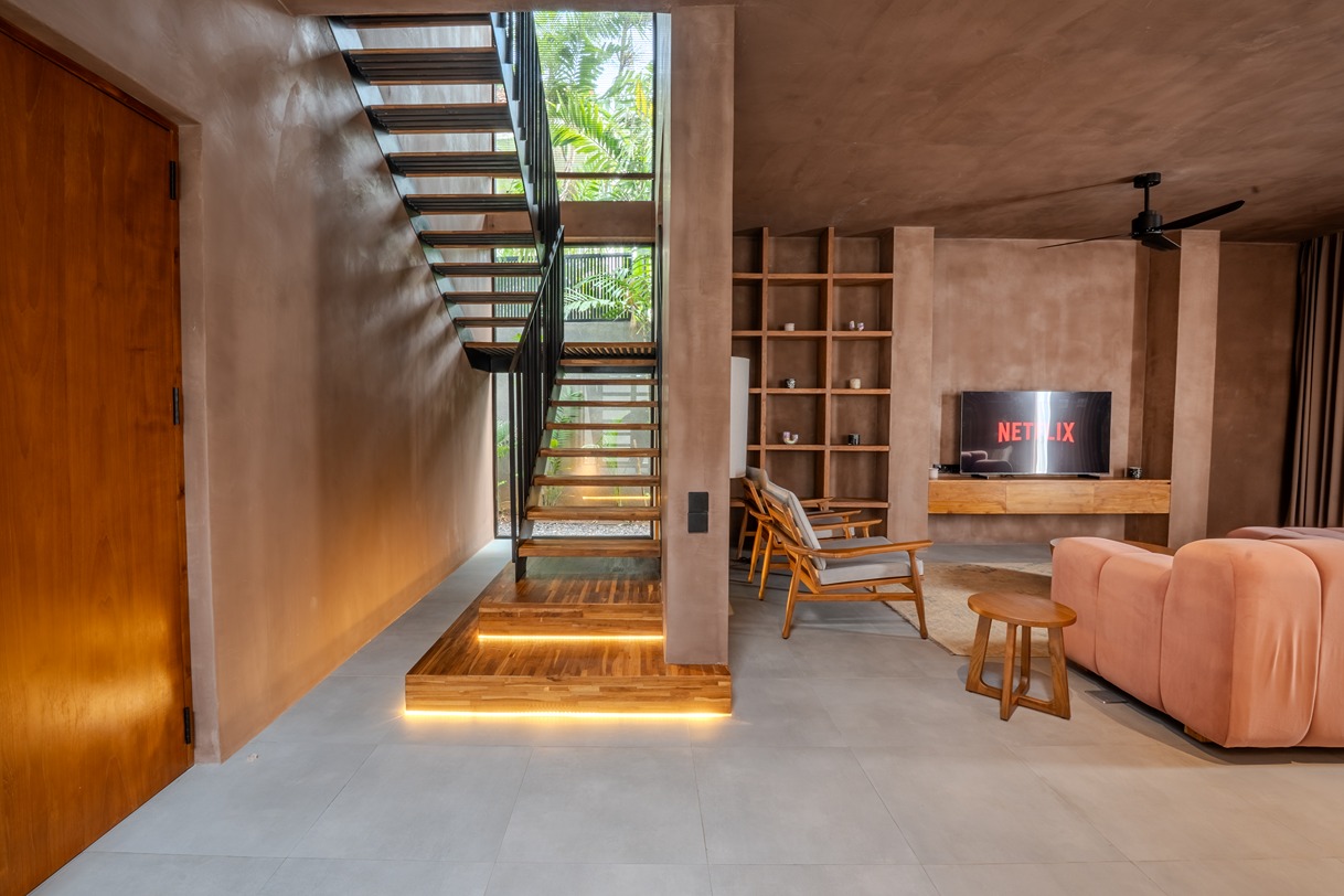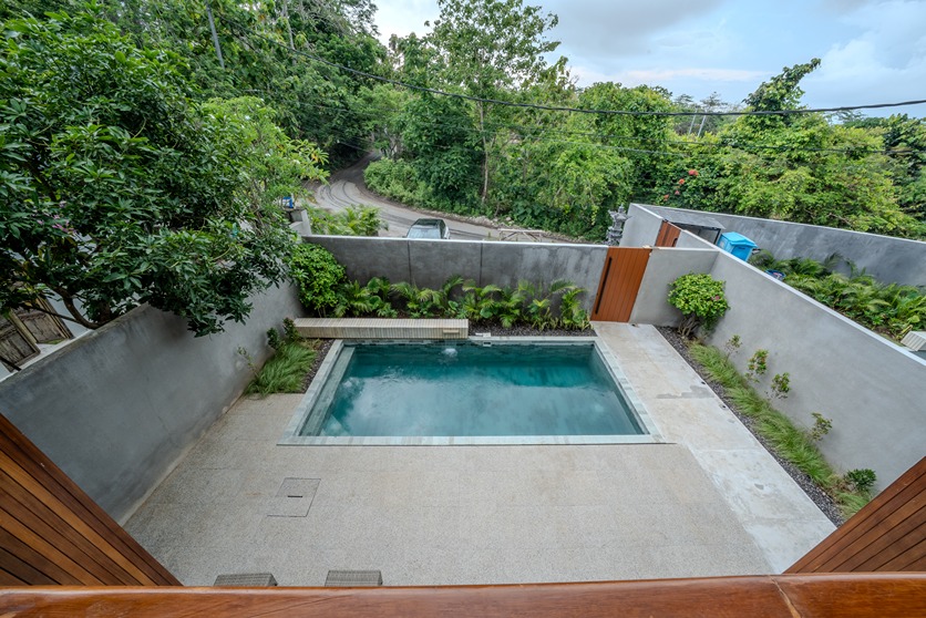 À l’extérieur, profitez d’une piscine privée, d’un espace lounge et d’un balcon à l’étage supérieur, idéal pour se détendre ou recevoir.