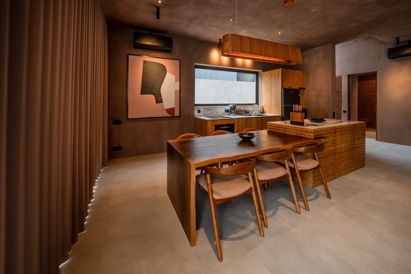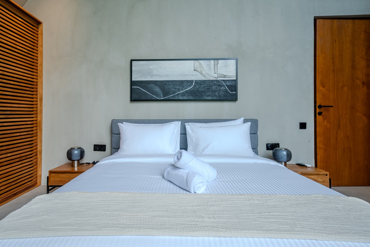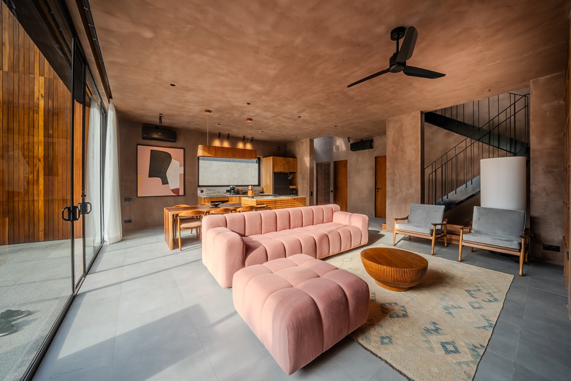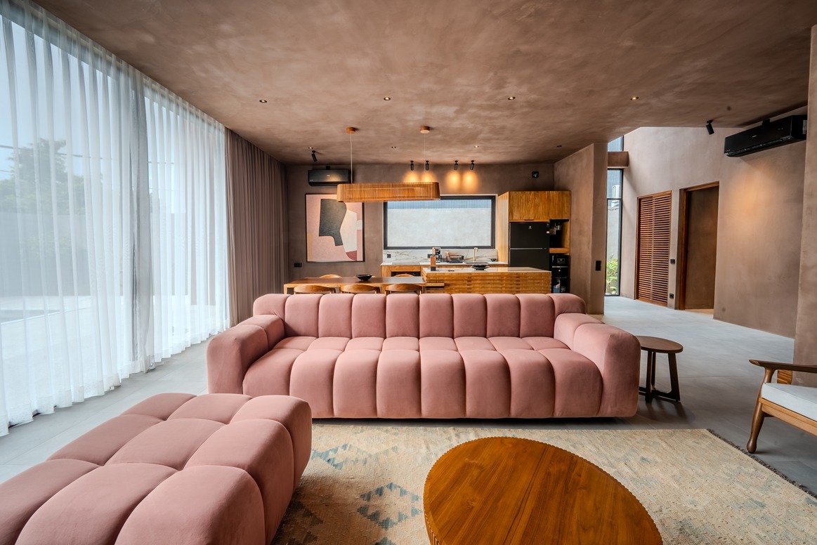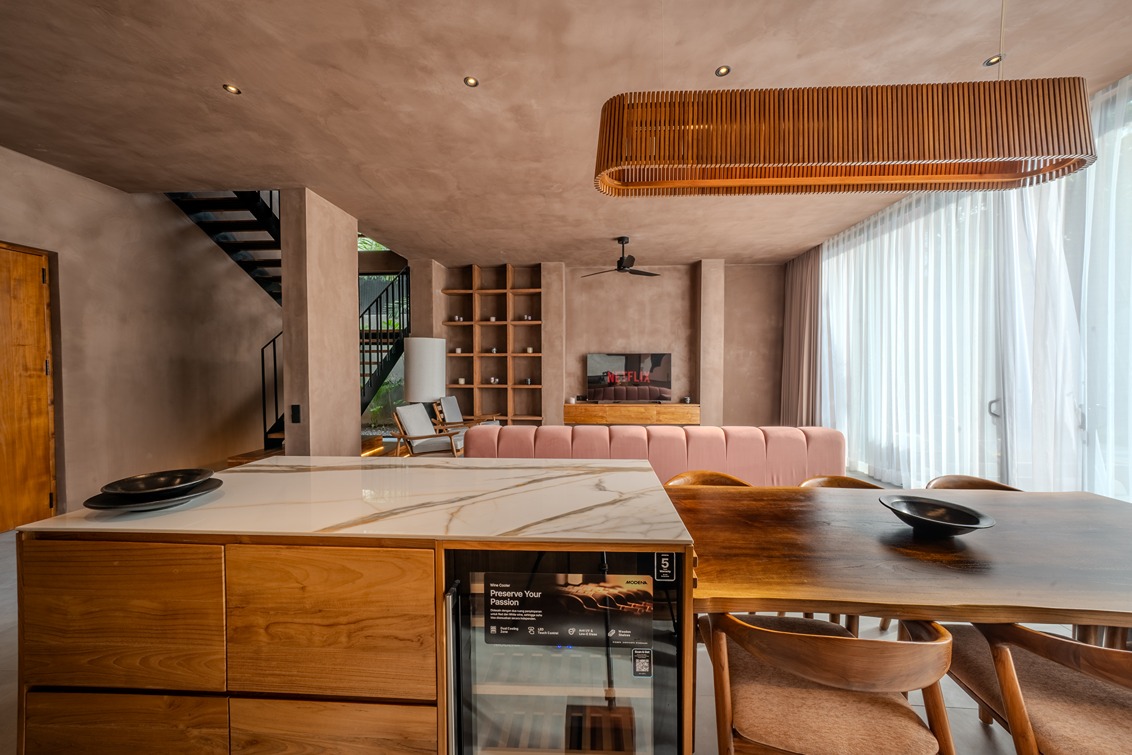 À l’extérieur, profitez d’une piscine privée, d’un espace lounge et d’un balcon à l’étage supérieur, idéal pour se détendre ou recevoir.