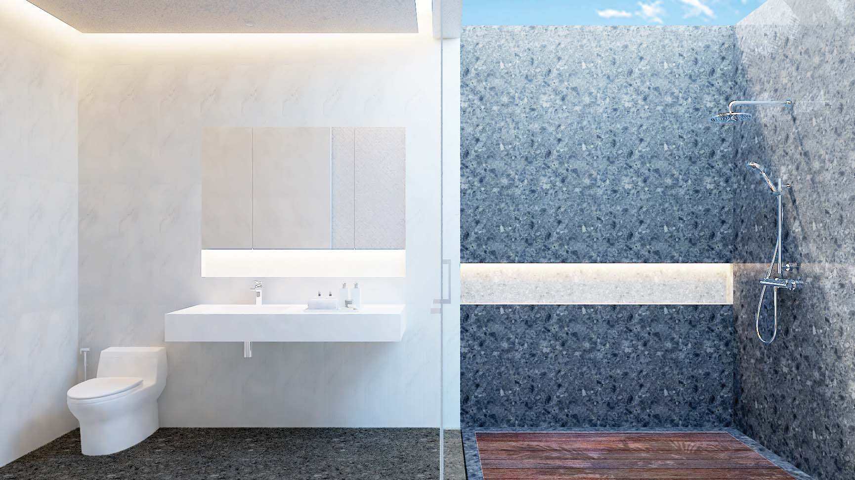 - Salle de bains : La salle de bains moderne comprend une douche, un lavabo et des toilettes séparées, garantissant confort et intimité.